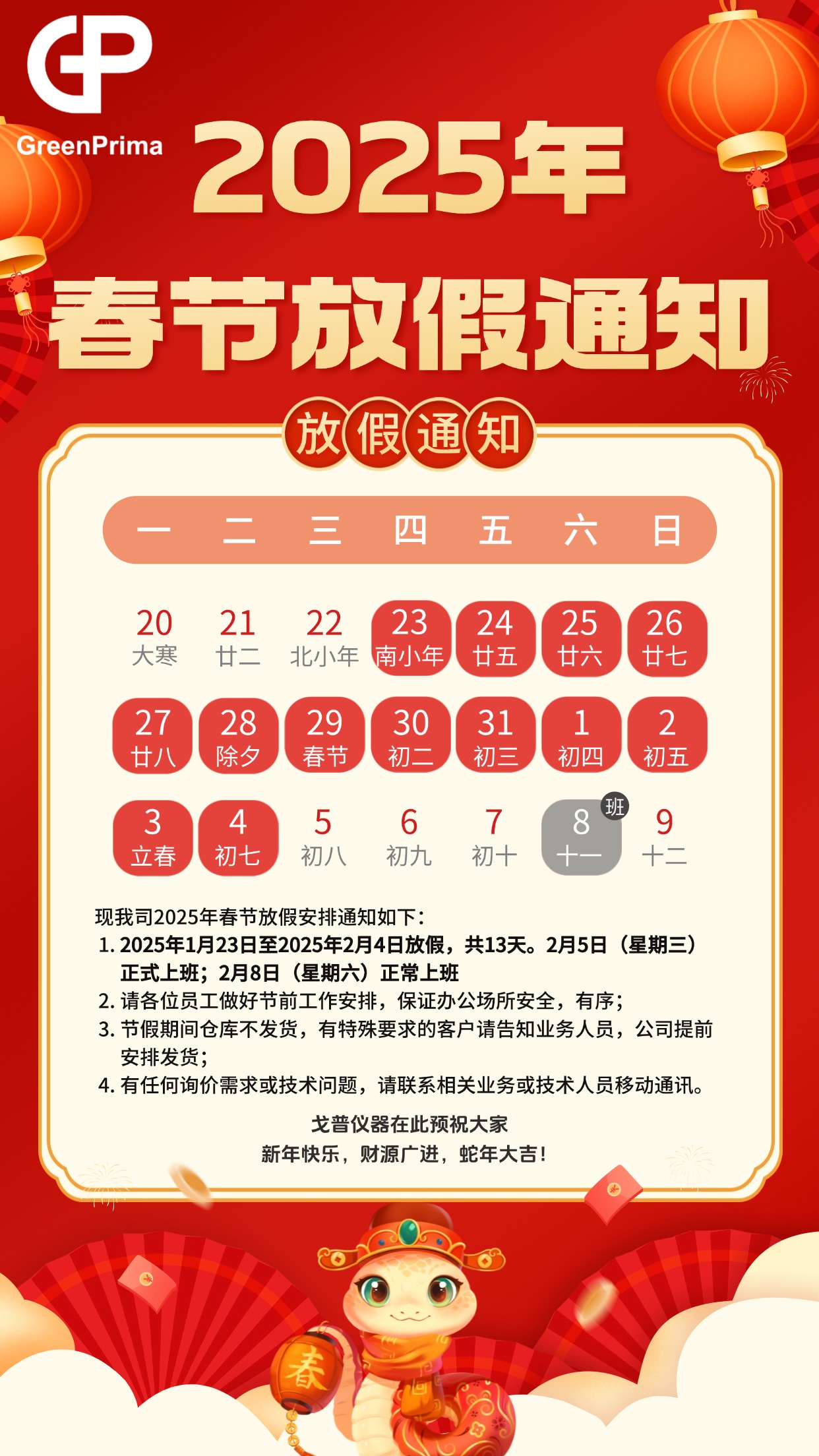 戈普儀器2025年春節放假安排:2025年1月23日至2025年2月4日放假,共13天。2月5日(星期三)正式上班;2月8日(星期六)正常上班